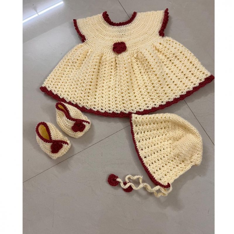 Adorable Handmade Crochet Frock Set for 1-Year-Old Baby Girls (Cream & Maroon)