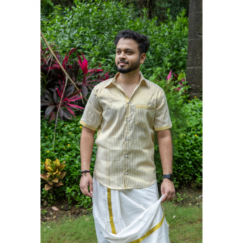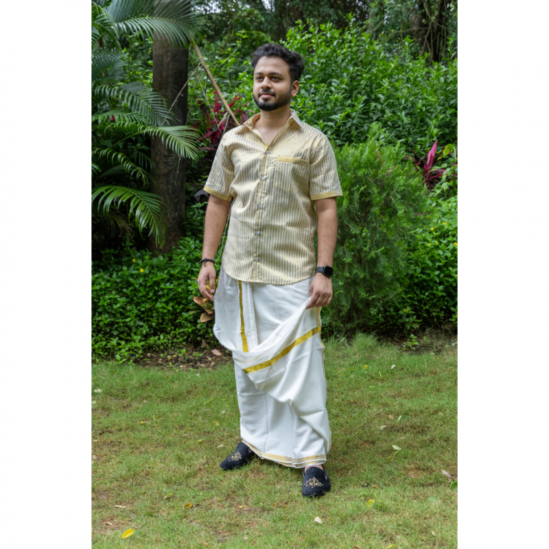 A shimmering Kasavu zari border in gold enhances the heritage and elegance of the costume. Traditionally, Kasavu zari borders have been seen only on sarees and women's costumes. We’ve incorporated Kasavu zari into our men's shirts to add a touch of elegance and tradition.