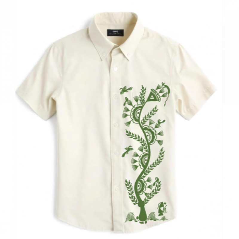 Men's Off- White Maharashtrian Folk Art Green Tribal Warli Design Shirt