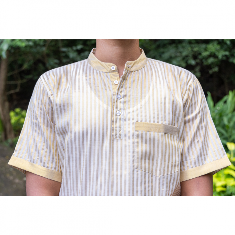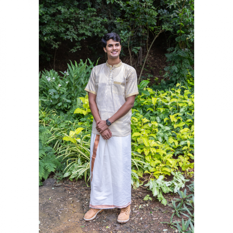 സ്വർണ്ണത്തിൽ തിളങ്ങുന്ന കസവു സാരി ബോർഡർ ഏത് വസ്ത്രത്തിൻ്റെയും പൈതൃകവും ചാരുതയും മനോഹരമായി വർദ്ധിപ്പിക്കുന്നു. പരമ്പരാഗതമായി, ഈ അതിമനോഹരമായ സാരി ബോർഡറുകൾ സാരിയും സ്ത്രീകളുടെ വസ്ത്രവും അലങ്കരിച്ചിരിക്കുന്നു, എന്നാൽ ആധുനികതയുടെയും പാരമ്പര്യത്തിൻ്റെയും സ്പർശം നൽകിക്കൊണ്ട് ഞങ്ങൾ പുരുഷന്മാരുടെ ഷർട്ടുകൾക്കായി അവയെ പുനർനിർമ്മിച്ചു.