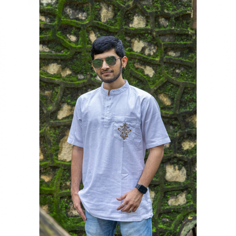 Soft Cotton Linen Blend Embroidered Floral Brown Motif Half Sleeve Short Kurta