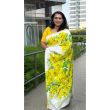 To complete the look with a modern twist, this saree comes paired with a striking contrast green blouse piece. The blouse features a stunning Golden Shower flower motif beautifully printed on the back, offering a gorgeous pop of color that perfectly balances the bright yellows of the saree.